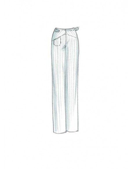 Pantalón recto con pequeña franja cortada en oblicuo, se abrocha con tiras, los bolsillos interiores se cierran con zip.