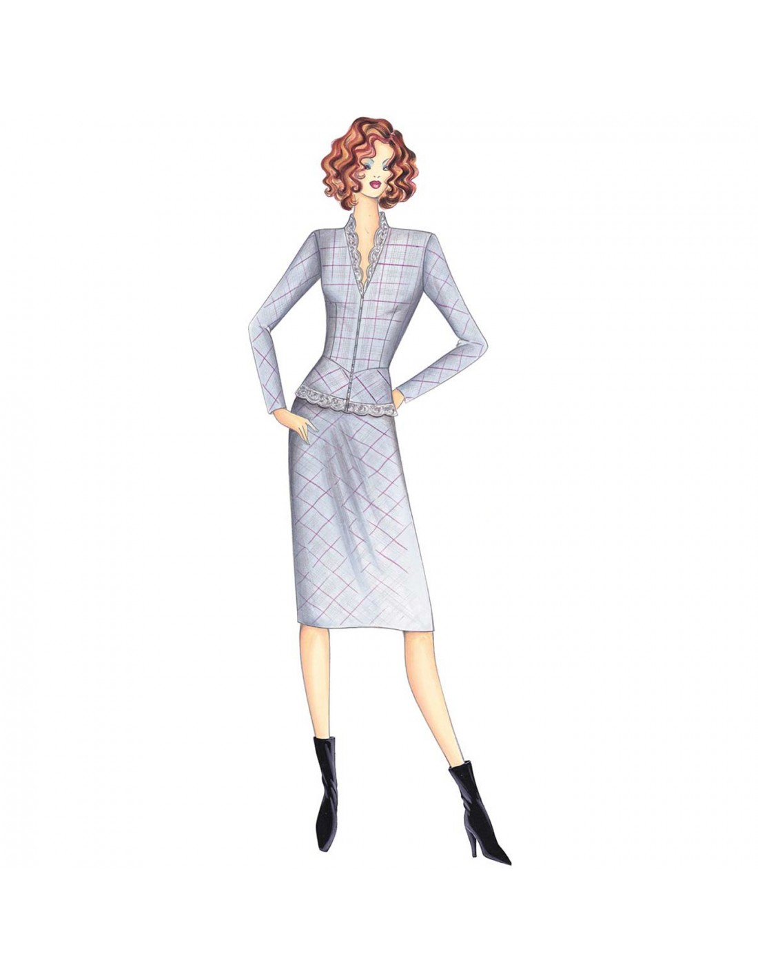 Vestido que parece dos piezas, se une con pequeños garfios, escote V y faldellín bordeados en encaje, mangas largas de vuelta y falda recta. Se puede realizar en tejido escocés, príncipe de Gales, rayado, grisalla o crespón.