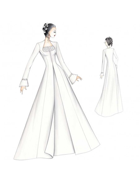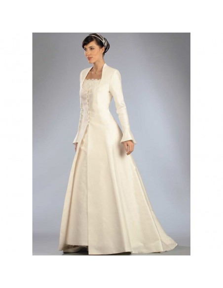 Es elegante y de realeza un redingote largo bord-a-bord de telas acampanadas en la parte inferior, escote corazón que descubre el encaje del vestido y mangas con puños de volante y abertura pequeña. Recomendable en mikado. Una aplicación de encaje decora el escote del vestido princesa sin mangas, escote cuadrado. Se puede realizar en mikado.