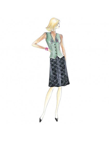 Falda de cuatro telas acampanadas, para hacerla en tejido bies. Chaleco n. 9644.