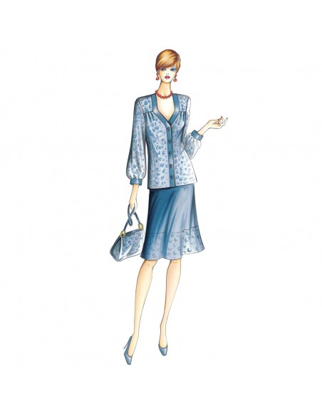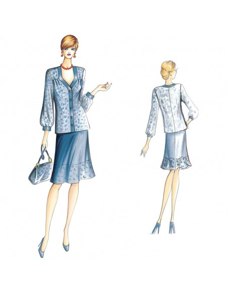 Falda acampanada con volante en la parte inferior, se puede hacer en satén, punto, crespón, el volante en georgette. Blusa n. 2461.