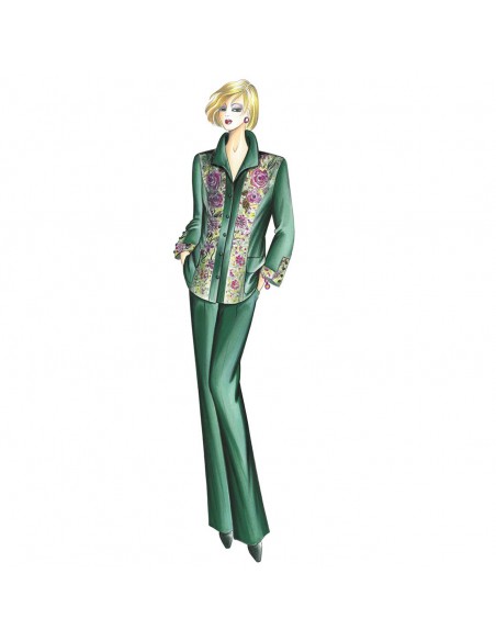 Chaqueta/cardigan de una sola fila de botones, línea semi-modelada, ancha y redondeada en la parte inferior, cuello tipo camisa, bolsillos de parche con solapa, mangas corte masculino bordadas en los puños. Se recomienda en jersey grueso de un solo color combinado con fantasía. Pantalones n. 1434.