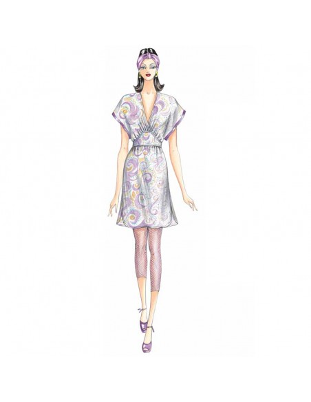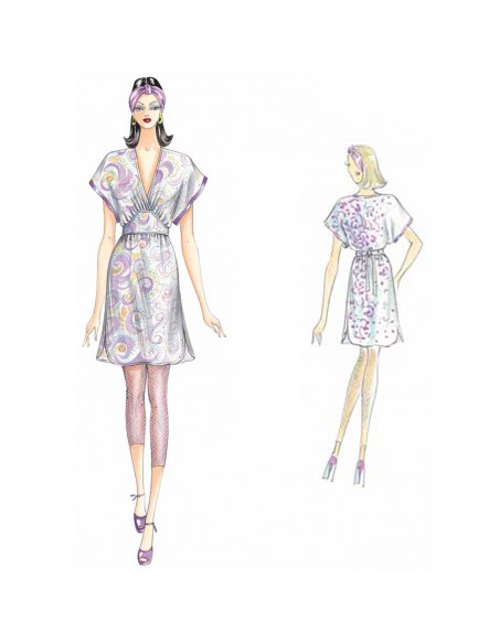 Mini vestido efecto casaca, cinturón perfilado y parcialmente aplicado para sujetar el fruncido del corpiño tipo kimono, falda acampanada. Se puede hacer en punto, satén, gasa.