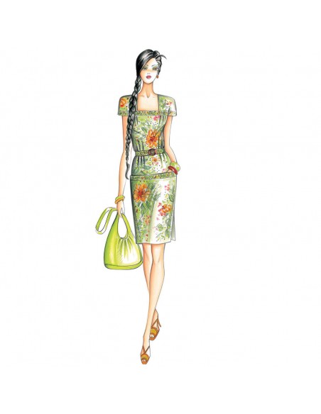 Vestido con pequeñas mangas kimono, escote cuadrado y corpiño con pinzas sueltas, falda con bolsillos ocultos y aberturas laterales. Recomendable en satén o tejido foulard.