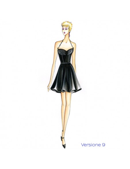 Vestido elegante y sensual de corpiño modelado tipo bustier. Se puede hacer tanto con escote recto como con escote corazón decorado con aplicaciones de estrás, perlitas, tachas o flores en tejido.