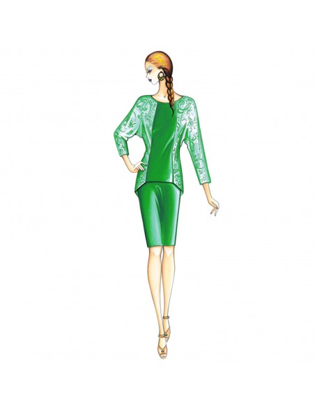 Blusa tipo kimono, modelada en las caderas y dobladillo por detrás en caída, cuello redondeado y cortes verticales para permitir su realización en dos tejidos o en colores distintos. Se puede hacer en punto, crespón de china, gasa.