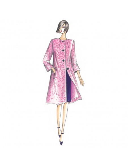 Abrigo de línea trapecio recomendable en brocado, doble satén o terciopelo, cuello redondo y bolsillos de vivo.