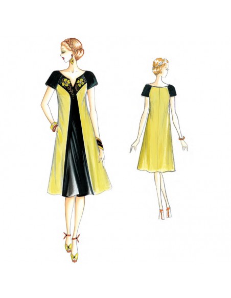 Vestido tipo trapecio con cortas mangas raglán y bolsillos interiores recomendable en satén de dos colores.