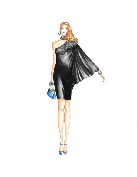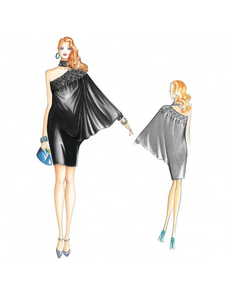 Minivestido de un hombro con una sola manga kimono ancha, en jersey de viscosa, satén o georgette con canesú asimétrico de terciopelo bordado, encaje o strass..