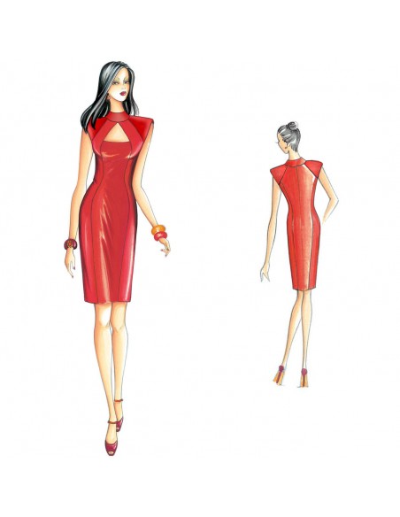 Vestido tubo con recortes de ánfora y hombros acolchados, escote triángulo que puede hacerse con o sin cuello banda.