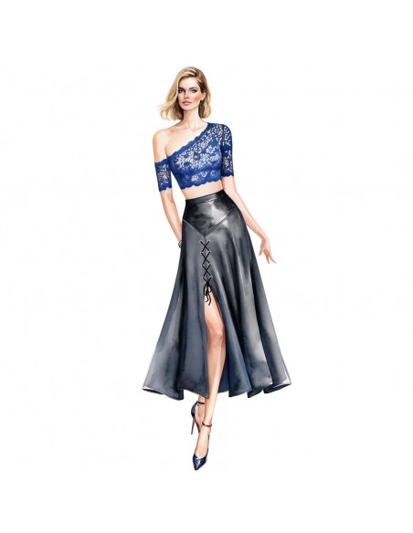 Falda acampanada dividida en dos partes, con basquín y abertura alta cerrada con cordones.