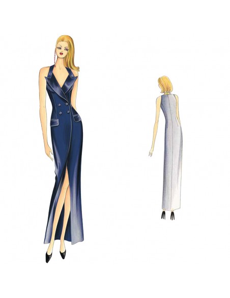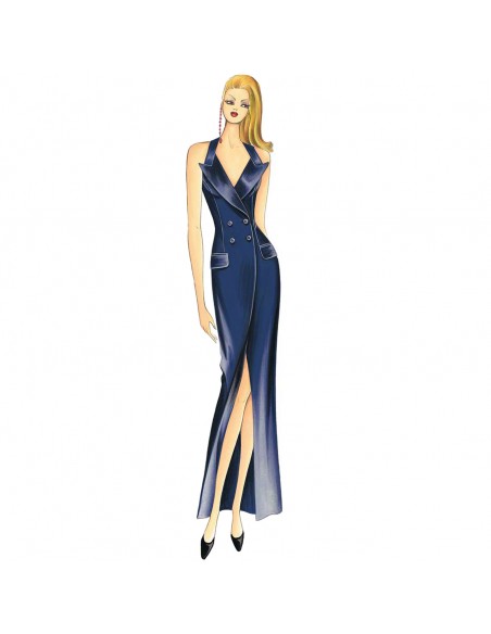 Robe-manteau de crepé, de doble cruce, preso con cuatro botones, bolsillos de solapa, cuello de solapa tipo lanza en tejido de raso.