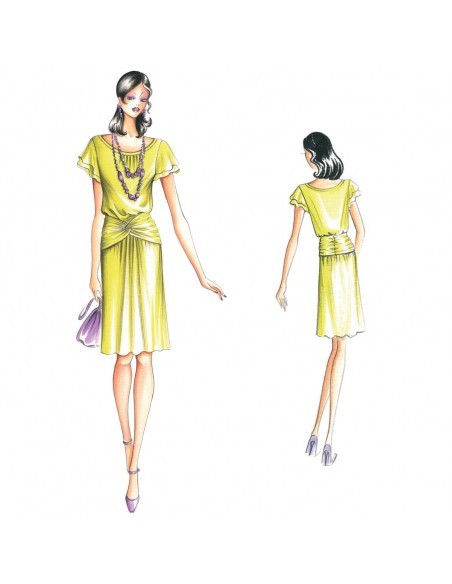 Top suelto, con mangas de doble volante, escote barca y fruncido. Falda n. 2171.