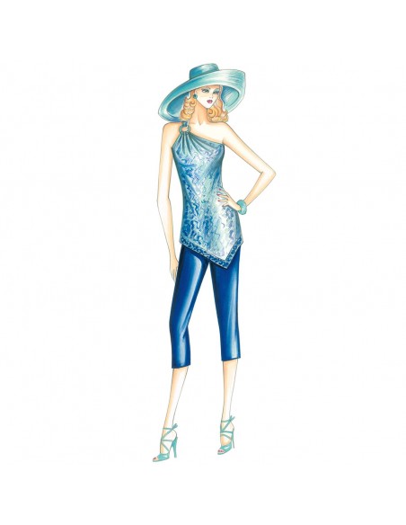 Top largo de un solo hombro, drapeado sobre el escote preso con la anilla de la tiranta, la parte inferior asimétrica forma una punta por delante. Se puede hacer en punto, chifón, gasa froissé. Pantalones estilo Capri de talle ligeramente bajo n. 9044.