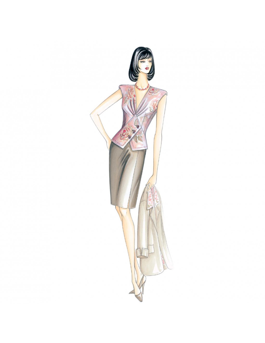 Top efecto chaleco, ideal también para debajo de la chaqueta, hombros acolchados, drapeado sobre el escote V del que baja el faldellín perfilado y abrochado con tres botones, abertura en la parte inferior. Se puede hacer en crespón de china o punto jacquard.