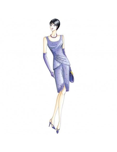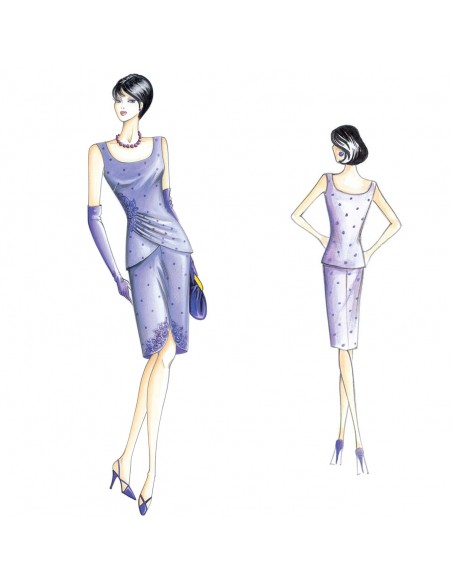 Conjunto, falda recta redondeada en la parte inferior y top asimétrico modelado, lleva drapeado preso sobre un lateral con una aplicación de encaje. Se puede hacer en crespón, raso duchesse, crespón de china.