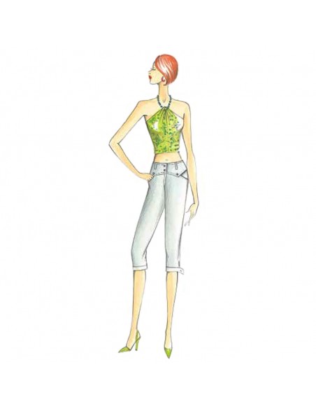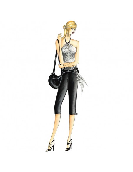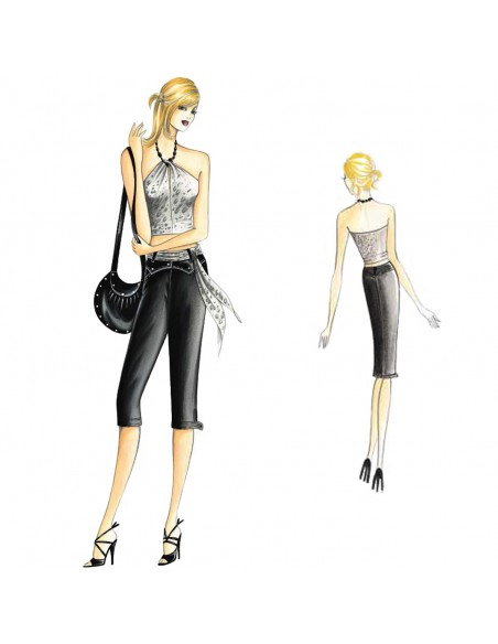 Pantalones modelo Pinocho, faldellín perfilado y bolsillos interiores, fular prendido con trabillas, top con listón tubular o perlas para sujetar la anchura del escote.