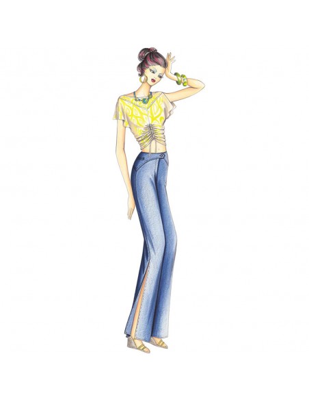 Pantalones vaqueros modelo ligeramente acampanado en la parte inferior con aberturas laterales, talle con ceñidor perfilado y bolsillos entorchados colocados en el lado. Top con corredera que forma fruncido y mangas en forma de quimono.