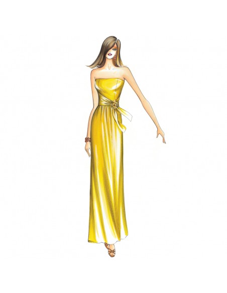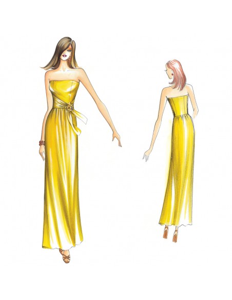Vestido de hombros descubiertos, fajín anudado en el lateral y falda de línea recta con ligero fruncido en el talle.