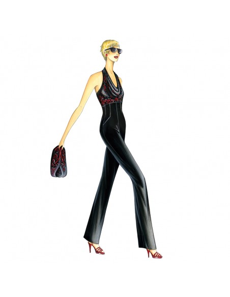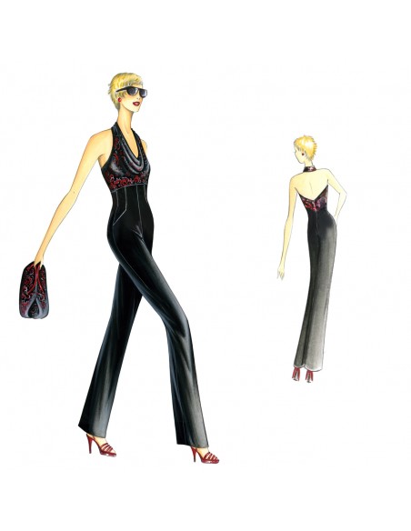 Chándal con pantalón de cintura alta, ligeramente acampanado, se puede hacer de crepé y jersey; top a la americana en jersey de cuello tipo capuchón.