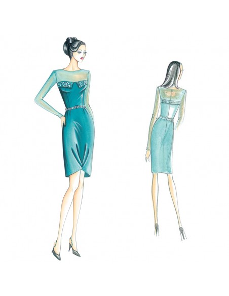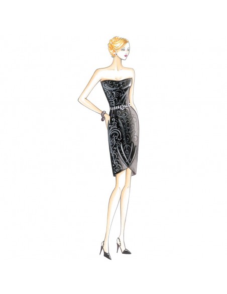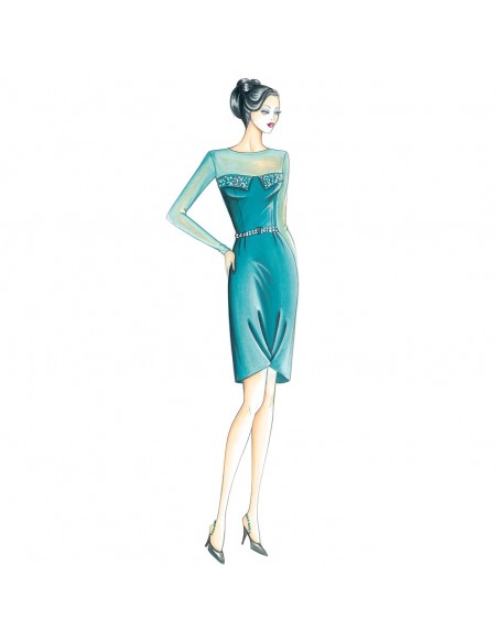 Vestido escotado, se puede hacer en raso duchesse o velvetòn, el canesú y las mangas en tul stretch, orillo bordado en forma de solapas ribeteadas en el escote y falda tipo tulipán con pliegues sueltos cruzados en la parte inferior.