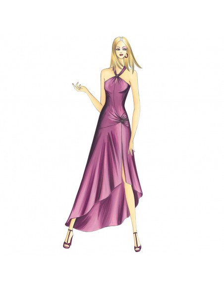 Vestido fino y moderno, con escote, modelado, juegos de drapeados cruzados en el escote y hacia un lado; la falda no muy ancha, al bies, tiene una gran abertura y borde diagonal que baja hacia atrás. Se puede hacer en gasa o jersey.