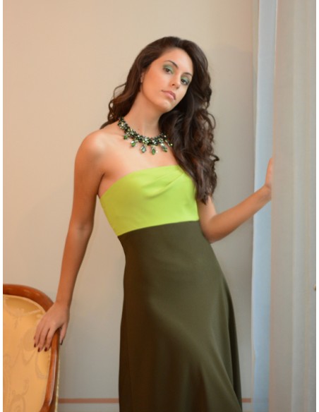 Vestido largo y elegante, escotado, deja los hombros descubiertos, sus pliegues ofrecen soltura, corte imperial y falda acampanada en la parte inferior. Se puede hacer en crespón, satén, organdí.