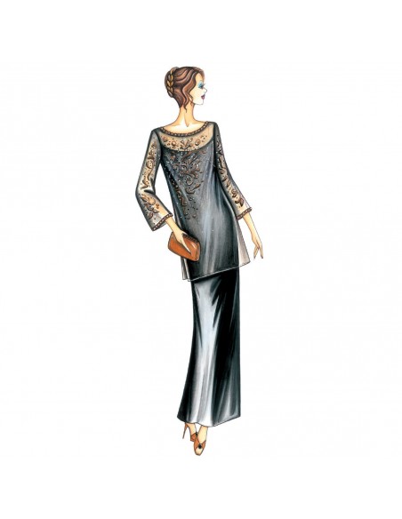 Conjunto formado por vestido-combinación largo, en parte aplicado en la vuelta de manga, se puede hacer en satén, punto o crespon y casaca, semirecta, con aberturas laterales, escote barca y mangas ¾ ligeramente acampanadas, recomendable en chifón, encaje chantilly o terciopelo devoré.