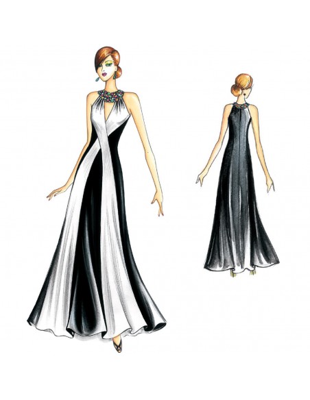 De gran efecto es el elegante contraste en blanco y negro sobre el largo vestido tipo princesa con paneles, que desde su pequeño cuello-joya bajan cruzándose por el talle y se abren en campana por la falda.