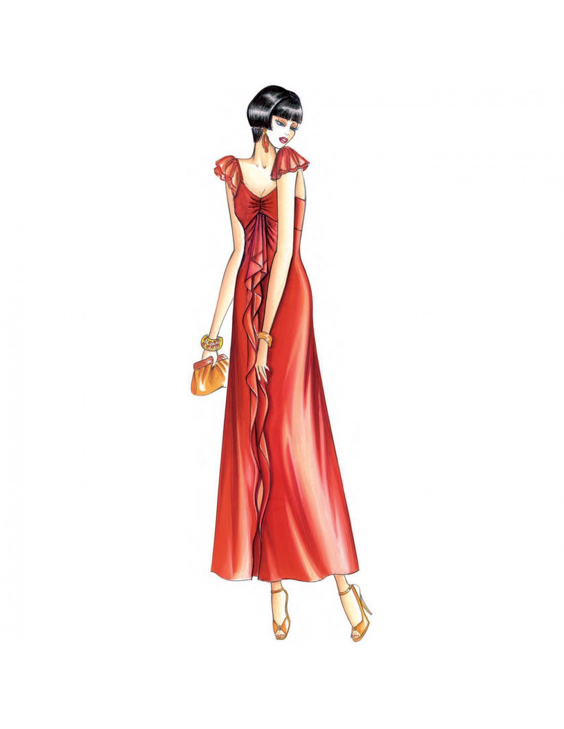Vestido de escote drapeado realizable con o sin volante en el centro de la falda, recomendable en muselina o crespón satén.