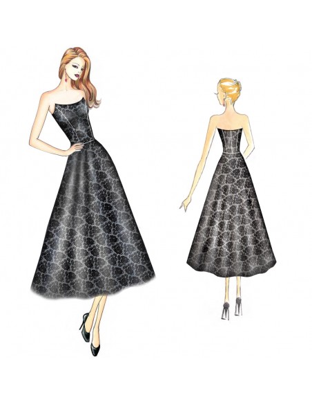 Elegante y trendy es el vestido de noche con corpiño de escote arqueado con puntas laterales y media falda. Puede ser enteramente de encaje de Chantilly o de tafetán, también con falda de tul doble.