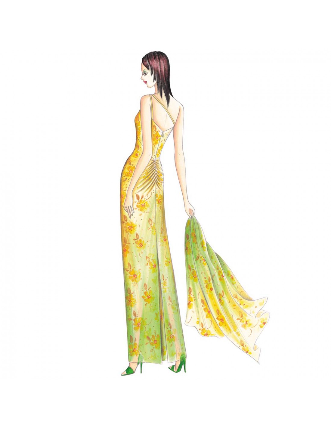 Vestido combinación largo, de un solo hombro con tirantas pequeñas dobles divididas en el dorso, corte imperial que baja en V por detrás hasta el drapeado que adorna la falda recta y abierta en la parte inferior. Se recomienda en punto, raso o gasa.