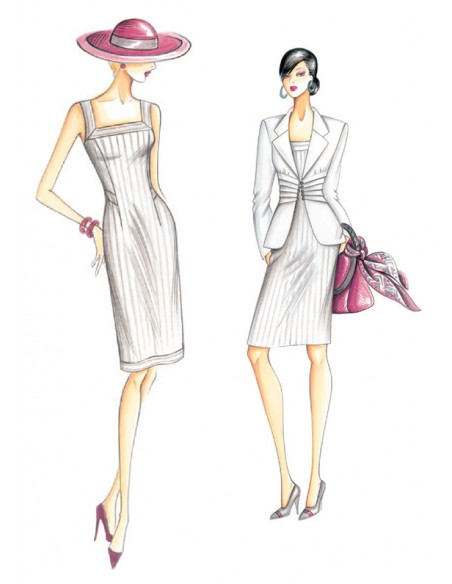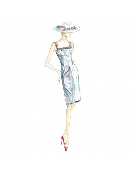 Mt. 1,10 alt. 1,40. Vestido ceñido sin mangas, escote cuadrado y dobladillo perfilados con orillo fantasía o bordado.Se puede combinar con la chaqueta 2745.