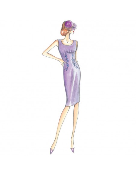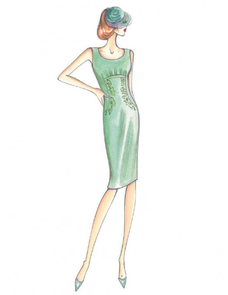 Vestido ajustado, se puede hacer en crespón, lleva un ligero fruncido que se inserta sobre el corte imperio, sus aplicaciones de encaje recorren los cortes arqueados y terminan en la cadera.