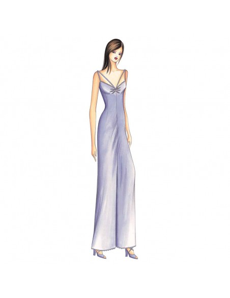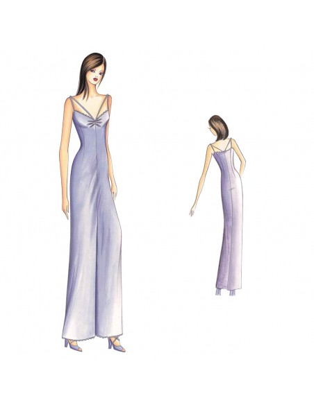 Vestido combinación largo, de línea modelada, recto, tirantas dobles que se dividen en el escote y convergen en el fruncido central, escote y dobladillo que acaban en pequeños ojales sueltos o pasamanería y abertura central arriba. Se puede hacer en crepé o cady, también en versión vestido-pantalón.