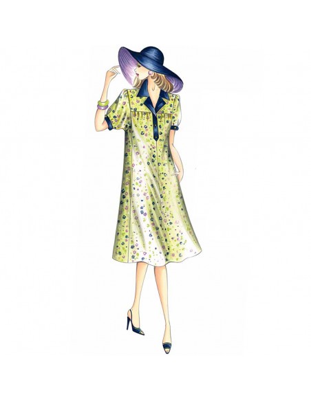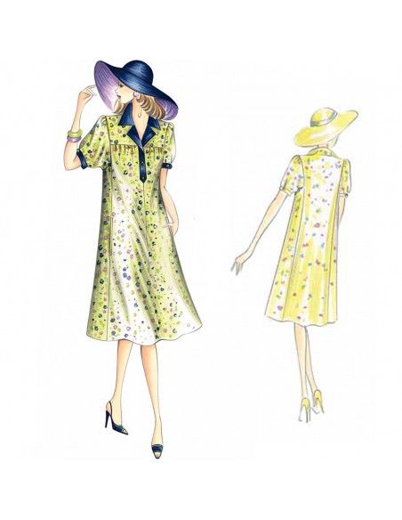 Vestido de línea trapecio y cuello polo, el canesú sujeta un ligero fruncido, la vuelta de manga prosigue en las pinzas, bolsillos interiores aplicados y mangas cortas fruncidas. Se puede hacer de muselina de algodón, lino, satén, sank gallen.