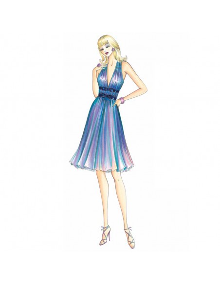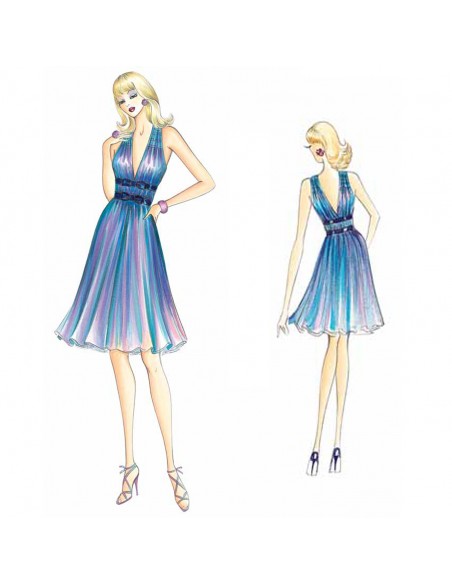 Vestido totalmente drapeado con una serie de costuras elásticas sobre los hombros, inspirado en un peplo, doble cinta en el talle y tipo imperio, falda amplia por la rodilla.Se puede hacer de chifón, punto, muselina de algodón.