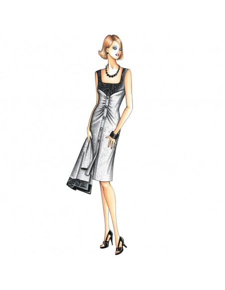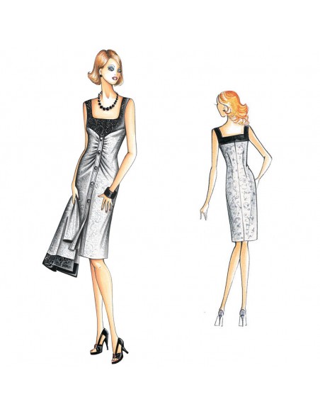 Vestido ceñido, sin mangas y escote ancho, la contraparte de la solapa central presa con botones sujeta el drapeado. Recomendable en punto o satén fantasía. Bolero n. 0144.