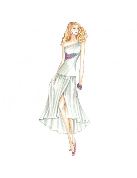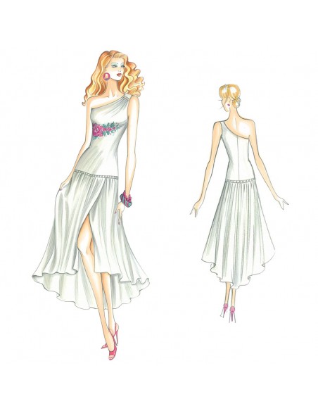 Vestido de un solo hombro, ajustado, corte imperio diagonal preso con bordado, drapeado sobre el hombro, la falda se abre bajo los laterales en un volante alto fruncido que baja por detrás y se cruza por delante formando una abertura oculta. Se puede hacer en punto, gasa, muselina, chifón.