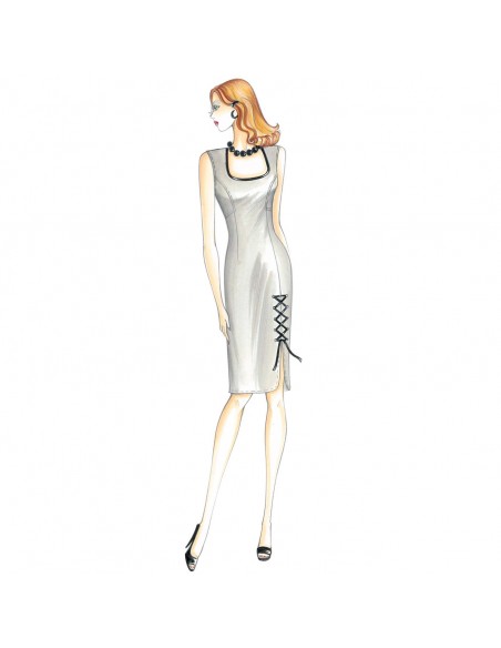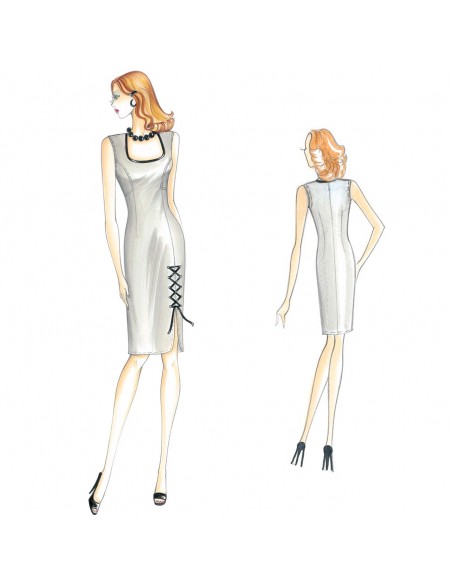 Vestido ceñido, modelado y sin mangas, la abertura redondeada lateral se abrocha con cordones cruzados, escote cuadrado. Se puede hacer en crespón, raso duchesse, punto grueso.