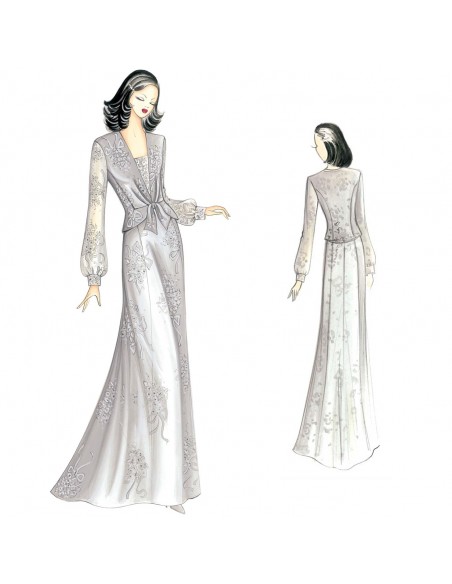 Vestido escotado de corpiño ajustado y de encaje, falda dividida en telas, de línea tipo richardia, se puede hacer en raso, gazar o mikado. Casaca n. 2627.