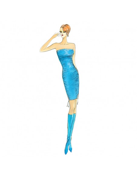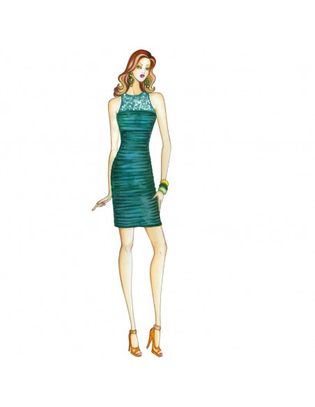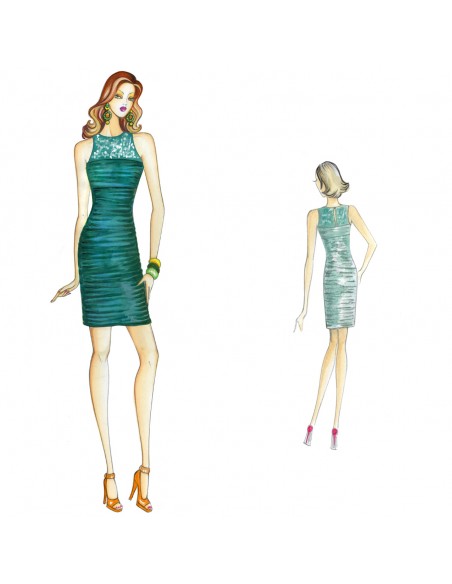 Vestido ajustado y drapeado, que se realizará en dos versiones: con escote o con escote. Se recomienda su confección en jersey.
