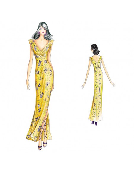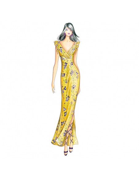 Vestido largo, se puede hacer en rayón challis o gasa, corte imperial que sujeta el cuerpo cruzado y drapeado de forma ligera, mangas de volante corto que baja en punta, falda con abertura lateral.