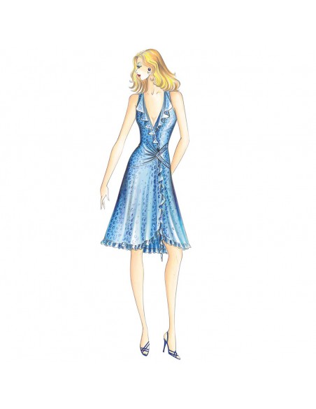 Vestido asimétrico, de línea ceñida, drapeado en el talle preso con un borde en forma de V, en estrás o lentejuelas, volantes chispeantes por el profundo escote en V, falda amplia en tejido biés, costado entero y redondeada en el lateral. Tejidos recomendables: jersey de seda o algodón, chifón, satín, seda lavada.