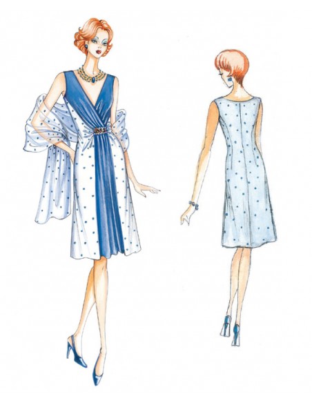Robe-manteau con combinación, recomendable en cady, jersey o gasa. Se puede hacer con o sin cuello drapeado y preso con cinturón bordado.