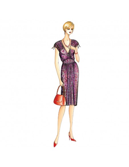 Vestido con motivo de fruncido suelto en el corpiño, mangas kimono, en la falda una pequeña franja aplicada. Tejido recomendable jersey de viscosa o muselina fantasía.