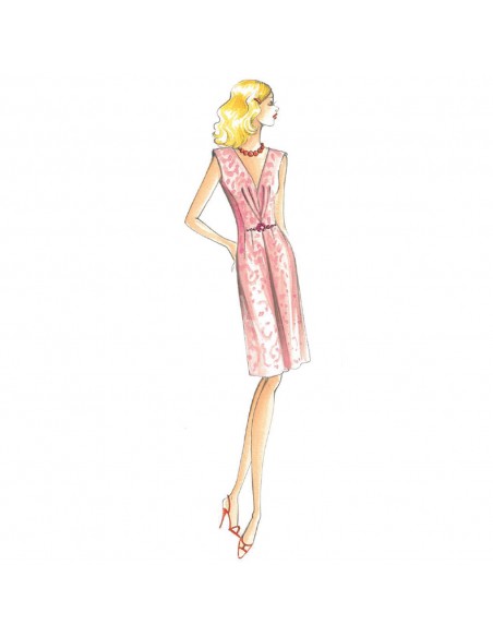 Vestido de hombros rectos y rellenos, escote ancho en V y pinzas sueltas, pequeño cinturón para marcar talle en la falda acampanada