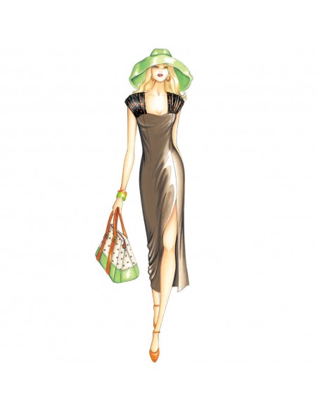 Vestido por la pantorrilla, recto y con abertura lateral, recomendable en lino o satén y hombreras drapeadas de gasa.