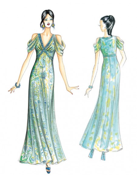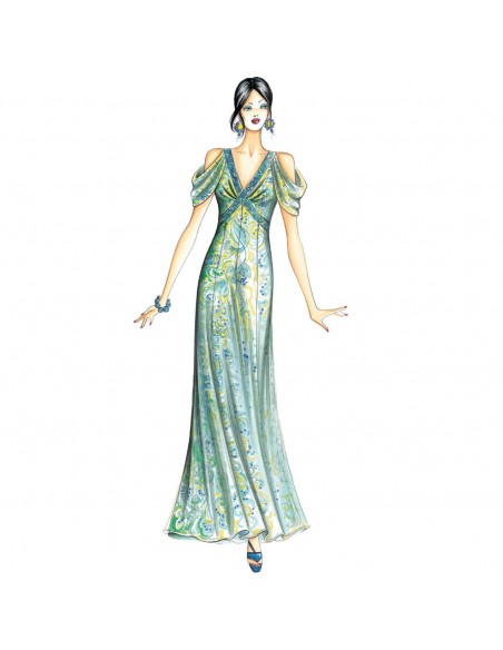 Vestido largo, para realizar en muselina de algodón o torzal, corpiño con escote V y mangas tipo capucha, falda de telas amplias en la parte inferior.