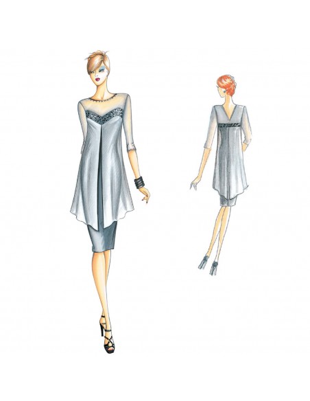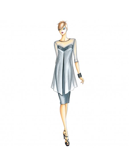 Vestido ceñido, en raso o crespón satén, con paneles de puntas alargadas en chifón y décolleté con un borde bordado o de strass.